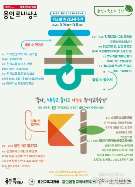 용인환경교육네트워크에서 주관하는 ▲ 환경극- 가치같이 콘서트 (7일, 단국대) ▲ 학교환경교육 교사 워크숍 (7일, 동백중학교) ▲ 환경교육 캠퍼스 포럼 (8일, 단국대) ▲ 제2회 환경교육 활동가 워크숍 (8일, 용인시기후변화체험교육센터) ▲ 환경교육 아이디어 제안 및 기업 사례 공유회(9일, 용인시기후변화체험교육센터)도 이어진다.