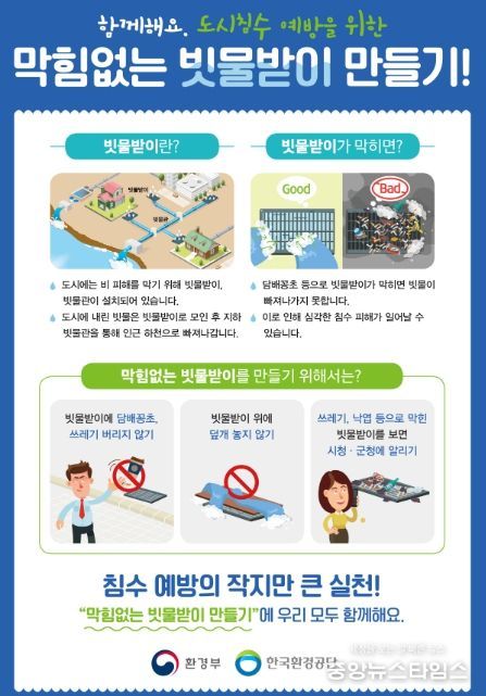 실천 항목은 ▲빗물받이에 담배꽁초 쓰레기 버리지 않기 ▲빗물받이 위에 덮개 놓지 않기 ▲쓰레기, 낙엽 등으로 막힌 빗물받이 발견하면 시·구청에 알리기 등이다.