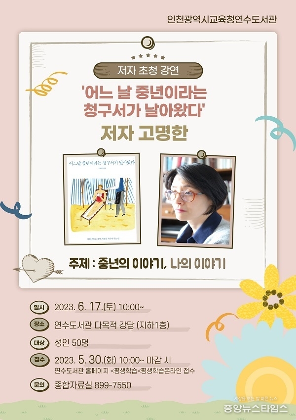 (중앙뉴스타임스 = 방재영 기자) 인천시교육청연수도서관은 6월 17일 ‘어느 날 중년이라는 청구서가 날아왔다’의 저자 고명한 작가를 초청해 ‘북 리스타트’ 주제 특강을 개최한다고 31일 밝혔다.