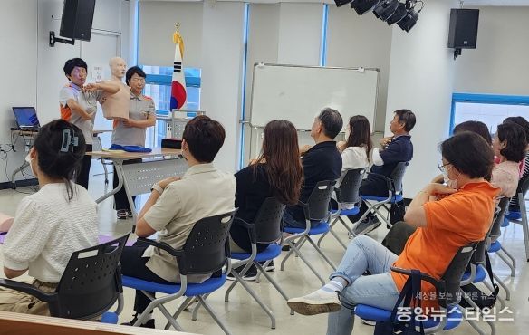 이날 교육은 일산소방서 의용소방대에서 ‘심폐소생술 이론교육’, ‘골든타임의 중요성’, ‘심폐소생술(CPR) 방법’, ‘자동심장충격기(AED) 사용법’ 등으로 진행됐다.