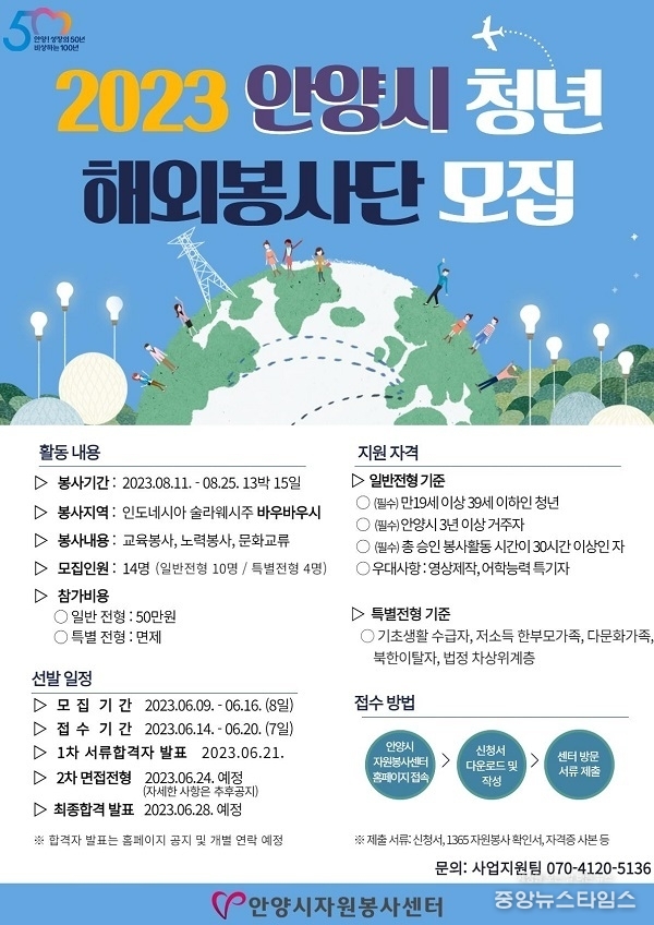 (중앙뉴스타임스 = 방재영 기자) 안양시 자원봉사센터는 오는 8월 인도네시아 바우바우시에서 활동할 청년 해외봉사단 14명을 모집한다고 13일 밝혔다.