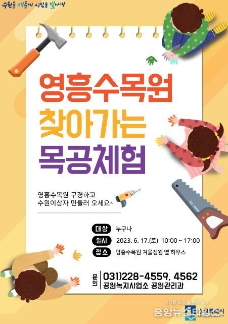 수원시 관계자는 “목공지도사와 함께 직접 목공품을 제작해 볼 기회”라며 “영흥수목원을 구경하고 목공 체험도 하면서 즐거운 추억을 쌓길 바란다”고 밝혔다.