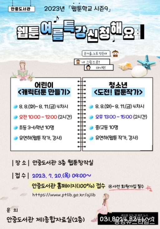 문화체육관광부가 주최하고 한국만화영상진흥원이 주관하는 이 사업은 시민들의 관심과 참여가 많아 오랜 기간 유지되고 있는 안중도서관만의 특화 사업이다. 이 사업의 하나로 상반기 웹툰 정기강좌와 웹툰 작가와의 만남이 성황리에 마무리됐고, 이어 여름방학을 맞이한 특강 프로그램이 운영될 예정이다.
