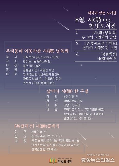 (중앙뉴스타임스 = 이광운 기자) 파주시 한빛도서관은 특정 분야에 대한 시민들의 관심을 높이고, 나아가 문학을 매개로 이웃과 소통하는 기획를 제공하고자 시(詩)를 주제로 8월 한달 간 다양한 독서행사를 운영한다.