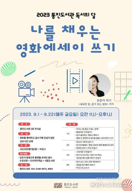 (중앙뉴스타임스 = 이광운 기자) 김포시 통진도서관은 오는 9월 독서의 달을 맞아 9월 1일부터 9월 22일까지 매주 금요일 오전 11시부터 두 시간 동안 천준아 작가와 ‘나를 채우는 영화에세이 쓰기’를 운영한다.