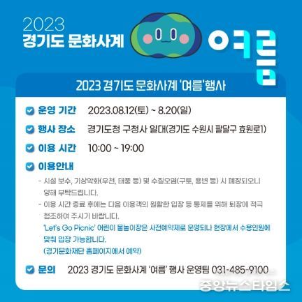 경기도 문화사계 '여름'은 지난 해 광교신청사로 이전한 경기도청 옛 부지인 ‘구청사’ 인근 지역경제 활성화와 경기도민 대상 문화향유기회 확대를 위해 기획된 문화행사로, 지난 봄 개최된 ‘경기도청 봄꽃축제’에 이은 여름 행사이다. 이번 여름 행사는 ‘let’s go picnic’을 주제로 어린이 물놀이장, 경기도 유관기관이 주관하는 문화체험프로그램과 K-pop 청소년 랜덤 플레이댄스, 인디스땅스 2023 본선경연 등 피크닉에 걸 맞는 다양한 볼거리, 즐길거리로 채워져 있다.