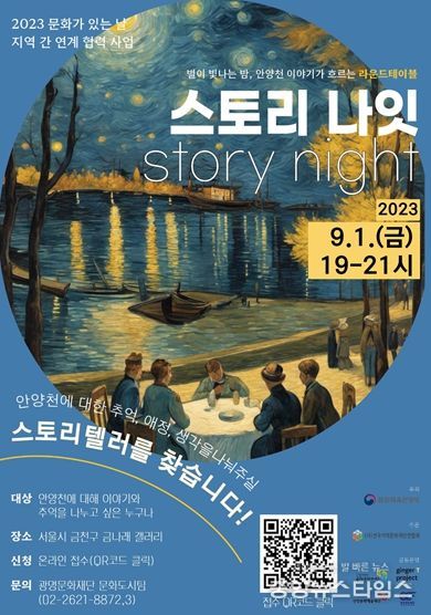 경기도 광명·안양·의왕·군포와 서울시 금천·구로·영등포 등 안양천 인접 지역 거주 시민이 함께하는 '스토리 나잇'에서는 참여자가 진행자의 안내에 따라 안양천을 소재로 다양한 이야기를 나누고, 결과물은 향후 지역 간 연계 문화사업의 기초 자료로 활용될 예정이다.