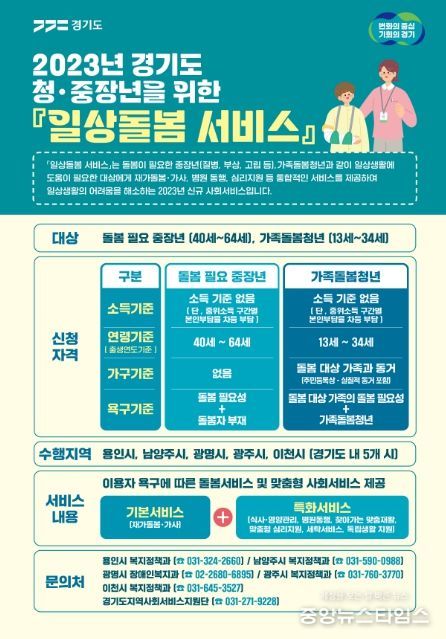 (중앙뉴스타임스 = 방재영 기자) 용인특례시가 돌봄이 필요한 중·장년과 가족돌봄청년을 위한 ‘일상돌봄 서비스’ 이용자 30명을 선착순으로 모집 중이라고 31일 밝혔다.