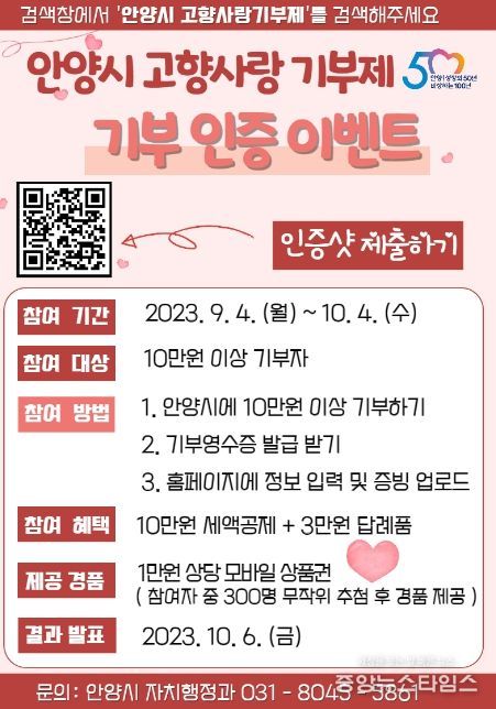 (중앙뉴스타임스 = 이광운 기자) 안양시는‘제1회 고향사랑의 날(9월 4일)’을 맞아 안양시 고향사랑기부자를 대상으로 기부 인증 이벤트를 실시한다.