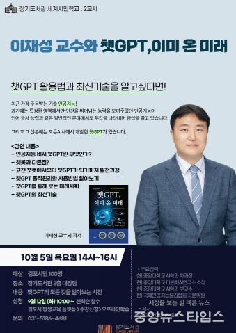 (중앙뉴스타임스 = 이광운 기자) 김포시 장기도서관(관장 이연화)은 세계시민학교 ‘이재성 교수와 챗GPT, 이미 온 미래’를 10월 5일 오후 2시부터 4시까지 운영한다.