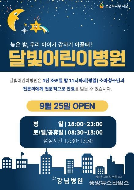 용인특례시 기흥구보건소는 기흥구 신갈동 강남병원(대표 정영진)을 달빛어린이병원으로 지정해 오는 9월 25일부터 2025년 9월24일까지 진료 시간을 연장하고 주 7일 연중무휴 운영키로 했다.
