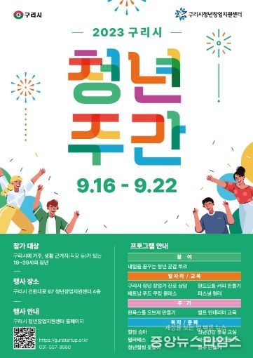(중앙뉴스타임스 = 이광운 기자) 구리시는 오는 9월 16일 청년의 날을 맞아 오는 16일부터 22일까지 구리시청년창업지원센터 등에서 ‘2023 구리시 청년주간’을 운영한다.