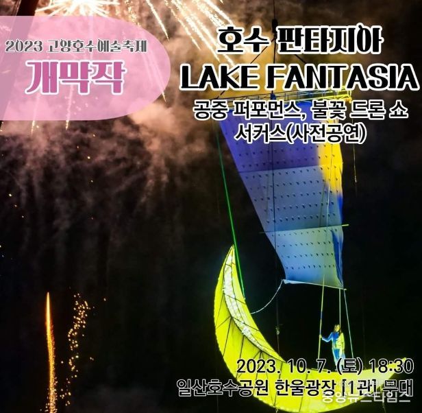 (중앙뉴스타임스 = 이광운 기자) 고양문화재단은 국내 대표 거리예술축제 ‘2023 고양호수예술축제’의 개막작으로 오는 10월 7일(토) 오후 6시 30분부터 일산호수공원 한울광장 무대에서 '호수 판타지아'를 선보인다. 이 작품은 호수를 배경으로 펼쳐지는 종합 퍼포먼스로 공중 퍼포먼스 ‘달의 약속’과 호수 수상을 화려하게 비추는 ‘불꽃 드론 쇼’로 구성된다.