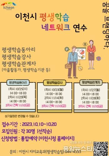 (중앙뉴스타임스 = 이광운 기자) 이천시는 지속가능한 평생학습도시 이천의 네트워크 구축을 위한 평생학습 강사, 동아리, 평생학습기관 등을 대상으로 역량강화 연수를 위해 오는 20일까지 수강생을 모집한다.