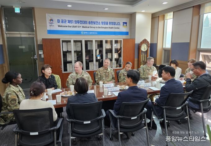 (중앙뉴스타임스 = 방재영 기자) 미 공군 제51 의무전대(USFA 51st Medical Group) 신임 전대장 콜 로빈슨 (Col Robinson) 대령 일행이 지난 12일 평택시(시장 정장선) 송탄보건소를 방문했다.