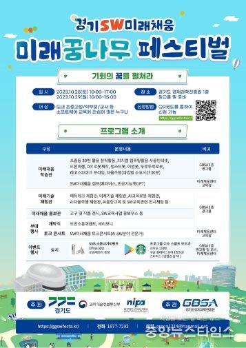 (중앙뉴스타임스 = 방재영 기자) 경기도와 경기도경제과학진흥원은 ‘미래의 꿈나무, 기회의 꿈을 펼쳐라’를 주제로 2023 경기소프트웨어(SW) 미래채움 페스티벌을 오는 28~29일 양일간 경기도경제과학진흥원 1층 광교홀 및 로비에서 개최한다.