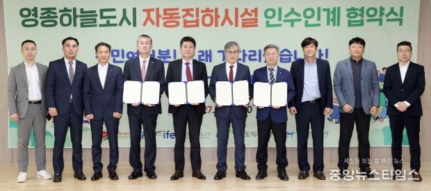 인천경제자유구역청은 27일 중구청에서 김진용 청장을 비롯 중구청, 한국토지주택공사(LH), iH(인천도시공사) 관계자 등이 참석한 가운데 ‘영종하늘도시 자동크린넷 인계인수 협약식’을 개최했다고 밝혔다.