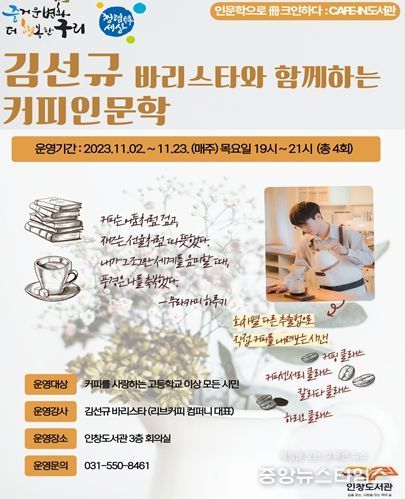 (중앙뉴스타임스 = 이광운 기자) 구리시 인창도서관은 오는 11월 2일부터 11월 23일까지 매주 목요일 저녁 7시에 인창도서관 3층 회의실에서 『CAFE-IN 도서관 : 커피 인문학』 특강을 운영한다.