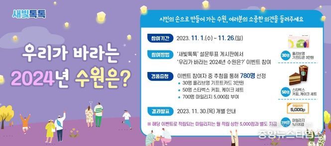 (중앙뉴스타임스 = 방재영 기자) 수원시가 오는 26일까지 새빛톡톡에서 ‘우리가 바라는 2024년 수원은?’을 주제로 11월 이벤트를 진행한다.