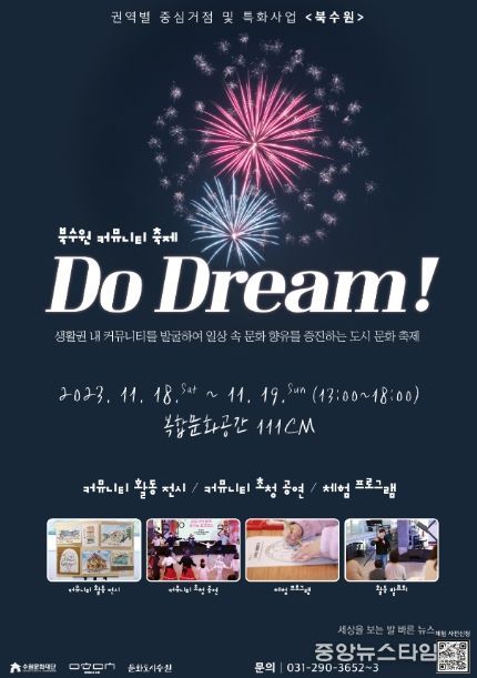 수원문화재단은 11월 18일부터 19일까지 복합문화공간 111CM에서 북수원 커뮤니티 축제 ‘Do Dream!’을 개최한다. ‘Do Dream!’은 북수원 생활권을 중심으로 커뮤니티 관계망 형성을 통해 시민들이 쉽게 소통, 참여, 공유할 수 있는 도시 문화 축제로, 18일은 상상현실 커뮤니티가 19일은 도시문화 커뮤니티가 참여하여 시너지 효과를 발휘할 예정이다.