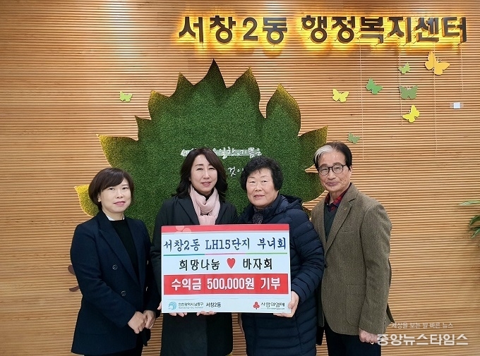 (중앙뉴스타임스 = 방재영 기자) 인천 남동구 서창2동 행정복지센터는 최근 인천서창엘에이치15단지 부녀회로부터 ‘불우이웃 돕기 바자회’ 수익금 50만 원을 전달받았다고 17일 밝혔다.