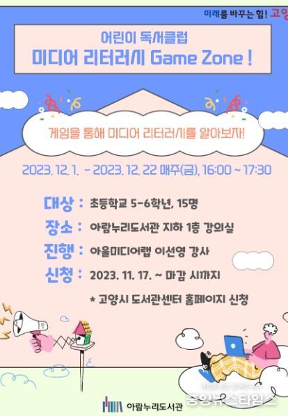 (중앙뉴스타임스 = 이광운 기자) 고양특례시 아람누리도서관은 12월 1일부터 22일까지 초등 5~6학년을 대상으로 ‘매체 이해력(미디어 리터러시) 게임 존’을 운영한다.