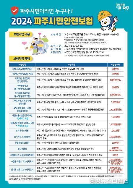 (중앙뉴스타임스 = 방재영 기자) 파주시가 예기치 못한 사고로부터 시민을 보호하기 위해 지난해보다 보장 범위가 확대된 시민안전보험을 운영한다.