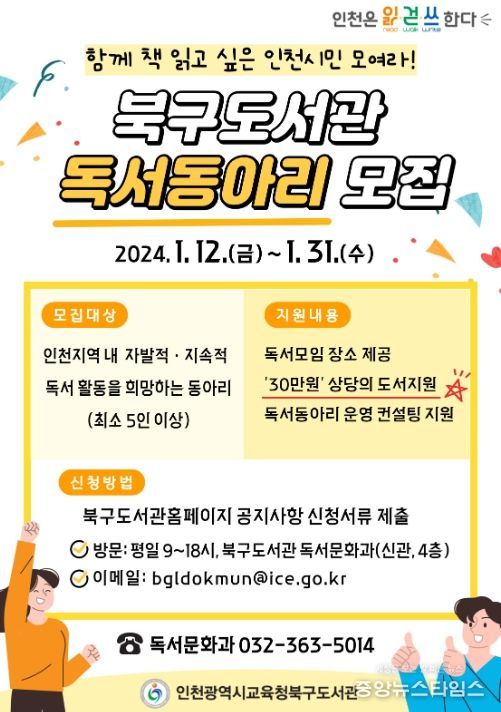 (중앙뉴스타임스 = 방재영 기자) 인천시교육청북구도서관은 읽걷쓰 사업의 일환으로 지역 내 다양한 독서동아리를 발굴하고 육성하기 위해 2024년 독서동아리 지원사업을 운영한다고 15일 밝혔다.