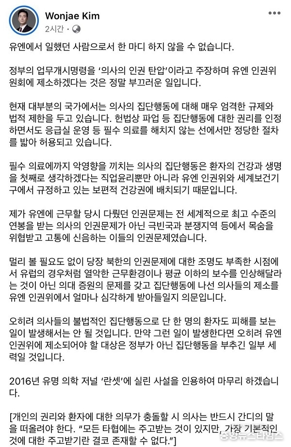 김원재 예비후보는 “제가 근무하던 유엔에는 전 세계적으로 최고 수준의 연봉을 받는 의사들의 인권문제가 아닌, 극빈국과 분쟁지역에서 생명을 위협받고 고통 받는 이들의 인권문제를 다뤘다”며 “유엔 인권위에서 유럽처럼 열악한 근무환경이나 평균 이하의 보수를 인상해달라는 것이 아닌 의대 증원을 문제삼아 집단행동에 나선 의사들의 제소를 얼마나 심각하게 받아들일지 의문이다”고 지적했다.