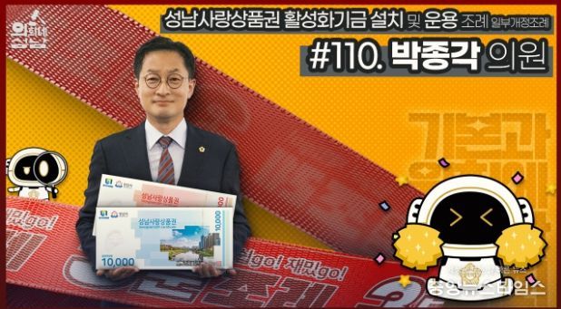 이번에 소개된 조례는 박종각 의원 등 15명이 발의한 ‘성남사랑상품권 활성화기금 설치 및 운용 조례 일부개정조례’이다. 이 조례는 성남사랑상품권을 효율적으로 관리함으로써 성남시 소상공인과 전통시장을 지원하고 지역경제를 활성화하기 위해 개정됐다. 이번 조례 개정을 통해 유효기간 내에 사용되지 않고 남은 상품권 금액과 운용 과정에서 발생하는 이자를 성남사랑상품권 활성화기금으로 편입하도록 명시함으로써 52억에 달하는 금액을 기금에 귀속시켜 관내 소상공인과 지역경제를 위해 활용할 수 있도록 했다. 이 조례는 2023년 10월 10일부터 시행 중이다.