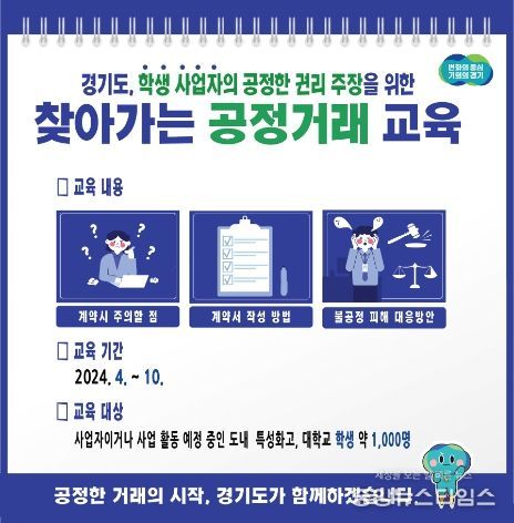 (중앙뉴스타임스 = 방재영 기자) 경기도는 오는 4월 30일 경희대학교 국제캠퍼스(수원)를 시작으로 10월까지 ‘2024 찾아가는 공정거래 교육’을 추진한다.