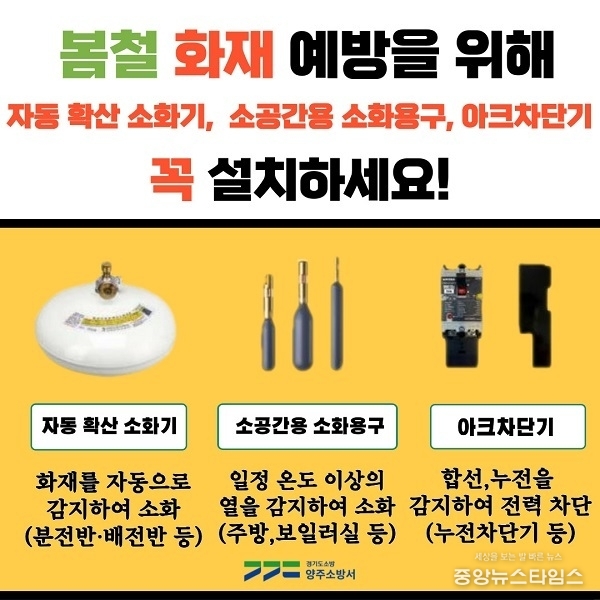 양주소방서는 화재에 취약한 봄철을 맞아 자동확산 소화기·소공간용 소화용구·아크 차단기 3가지의 소방 용품 중요성을 강조하고 있다.