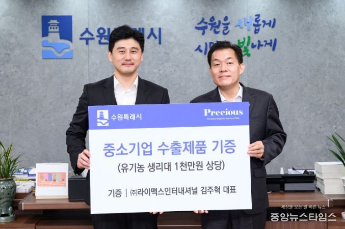 ㈜라이맥스 인터내셔널 김주혁 대표는 13일 수원시청을 방문해 이재준 수원시장에게 자사 생산 제품인 ‘프레셔스 유기농 생리대’ 2700개를 전달했다.