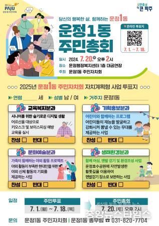 조동준 운정1동장은 “주민총회는 주민들이 직접 참여해 우리 마을을 발전시킬 수 있는 소중한 기회인 만큼, 주민들의 많은 참여와 관심을 부탁드린다”라고 전했다.