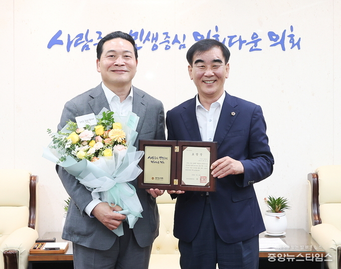 (중앙뉴스타임스 = 방재영 기자) 염종현 경기도의회 의장이 16일 의장 접견실에서 ‘지역봉사 발전 유공자 표창 수여식’을 실시했다.