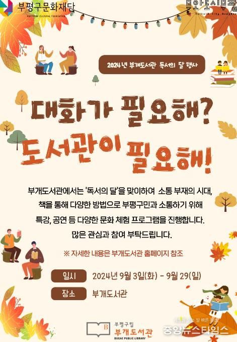 (중앙뉴스타임스 = 방재영 기자) 인천 부평구 구립 부개도서관은 오는 9월 한 달간 ‘대화가 필요해? 도서관이 필요해!’라는 주제로 독서의 달 행사를 진행한다.