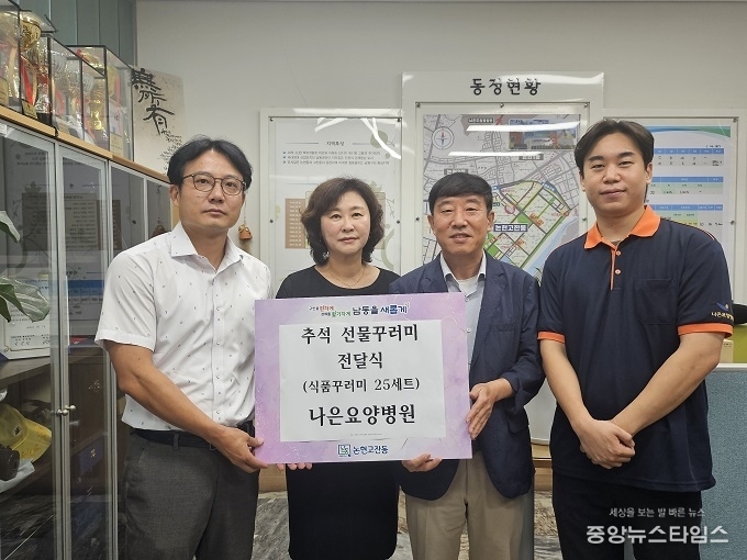 (중앙뉴스타임스 = 방재영 기자) 인천 남동구 논현고잔동 행정복지센터는 나은요양병원으로부터 추석 명절 통조림 선물세트 25개와 재래 김 10세트를 기탁받았다고 9일 밝혔다.