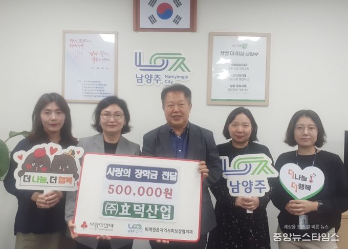 (중앙뉴스타임스 = 방재영 기자) 남양주시에 소재한 ㈜효덕산업은 지난 4일 퇴계원읍사무소에서 김주헌 퇴계원읍장 등 퇴계원읍 관계자가 참석한 가운데 취약계층 학생들을 위한 장학금 전달식을 가졌다.