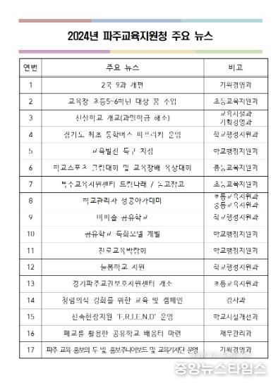 선정될 주요 뉴스 후보로는 '2국 9과 개편을 통한 행정 효율성 강화', '경기도 최초의 통학버스 파프리카 운영으로 학생 교통 편의 증대', '특수교육지원센터 드림나래와 놀고잡고 프로그램을 통한 특수교육 지원 확대', '교권 보호를 위한 경기파주교권보호지원센터 개소', '폐교를 활용한 공유학교 운영으로 지역 자원의 효율적 활용' 등이 포함되어 있다. 이러한 성과들은 지역 사회와 교육 공동체에 의미 있는 변화를 가져왔으며, 앞으로도 파주 교육 발전의 초석이 될 것이다.
