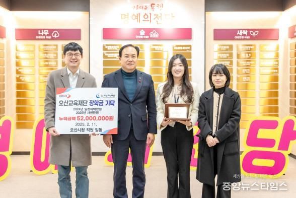 (중앙뉴스타임스 = 방재영 기자) 오산시가 지난해(2024년) 다양한 시책 및 사업에서 우수한 성과를 거둬 수상한 포상금의 일부인 5천200만 원을 명예의 전당에 특기장학금으로 기탁했다고 12일 밝혔다.