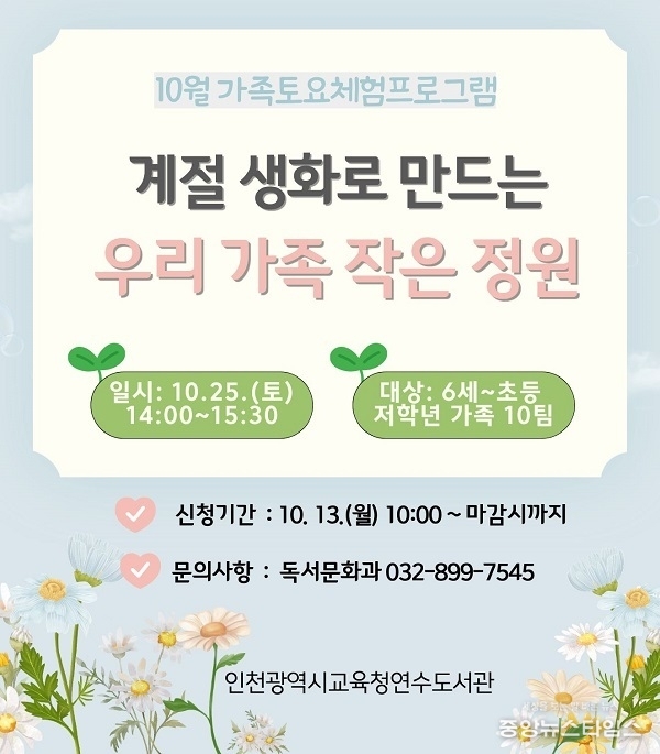 (중앙뉴스타임스 = 방재영 기자) 인천시교육청연수도서관은 오는 25일 오후 2시 평생학습1실에서 가족 이용자를 위한 ‘10월 가족 토요체험 프로그램’을 운영한다고 10일 밝혔다.