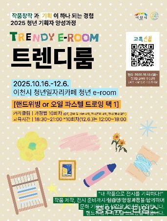 ▲오일파스텔 드로잉 ▲핸드위빙으로 구성하여 예술 작품 제작 및 전시를 준비 및 운영함으로써 문화 기획과 창작 역량을 동시에 강화하는 본 과정은 19세 이상 39세 이하 관내 청년이면 누구나 10월 13일부터 큐알(QR)코드를 통해 신청할 수 있다.