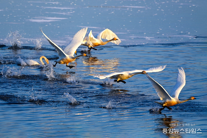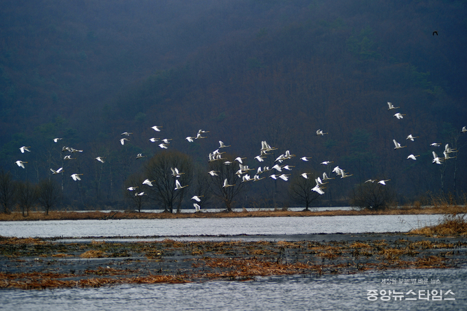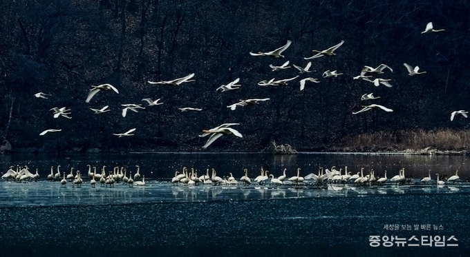 (중앙뉴스타임스 = 방재영 기자) 팔당물안개공원에 흰 날개를 휘날리며 백조들이 찾아왔다.