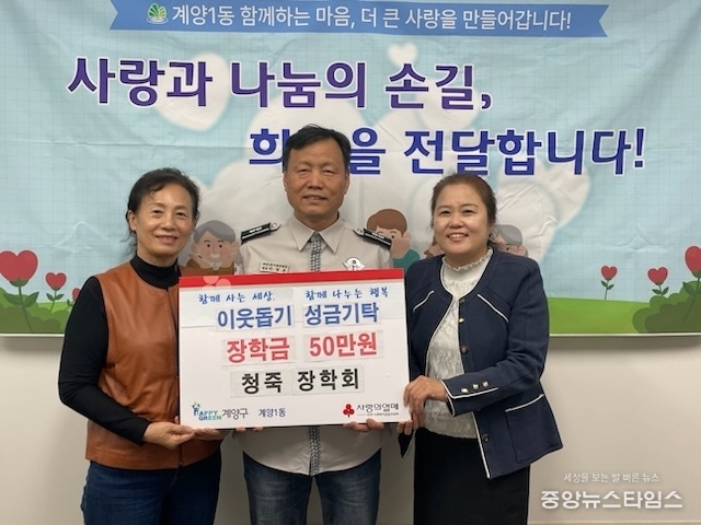 (중앙뉴스타임스 = 방재영 기자) 인천 계양구 계양1동는 11일 청죽장학회가 지역 학생들을 위한 장학금 50만 원을 기부했다고 밝혔다.