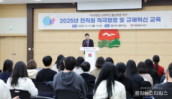 (중앙뉴스타임스 = 방재영 기자) 인천시 중구는 지난 17일 중구청 월디관 대회의실에서 전 직원을 대상으로 ‘2025년 적극행정 및 규제혁신 교육’을 실시했다.