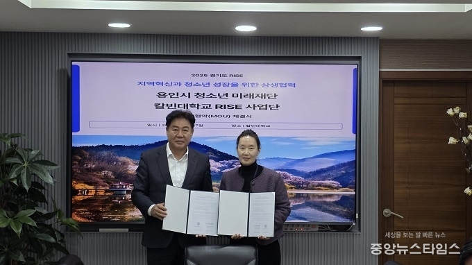 (중앙뉴스타임스 = 방재영 기자) 용인시청소년미래재단(대표이사 김영우)과 칼빈대학교(사업단장 조한숙)는 지난 17일 칼빈대학교에서 간담회 및 업무협약식을 개최하고, 경기도 RISE 사업 내 지역사회 공헌 프로그램의 원활한 추진을 위해 상호 협력을 약속했다.