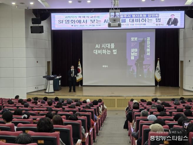 (중앙뉴스타임스 = 방재영 기자) 광주시는 지난 24일 오후 7시 광주시청 수어장대홀에서 300여 명의 시민을 대상으로 곽재식 교수 초청 ‘2025년 제3회 명사 초청 강연회’를 개최했다.