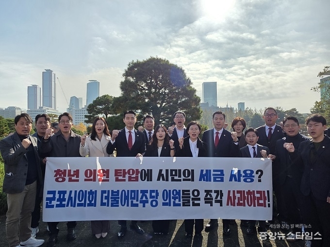 (중앙뉴스타임스 = 방재영 기자) 군포시의회 박상현 의원은 지난 23일 전국 각지의 청년 지방의회 의원 14인과 함께 국회의사당 앞에 모여 군포시의회 더불어민주당이 자행한 박상현 의원에 대한 위법 징계와 정치적 탄압에 대해 강력 규탄하는 공동 성명을 발표했다.