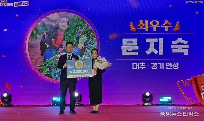 (중앙뉴스타임스 = 방재영 기자) 농림축산식품부 주최, 한국과수농협연합회 주관으로 하는 ‘2025 대한민국 과일산업대전 대표과일선발대회’에서 안성시가 2023년부터 대추부문에서 최우수상, 우수상을 수상하여 3년 연속 대추부문 최고자리에 올랐다. 수상자로 문지숙 대표가 최우수상(농림축산식품부장관상)으로 선정됐고, 조재곤 대표가 우수상(산림청장상)으로 선정됐다.