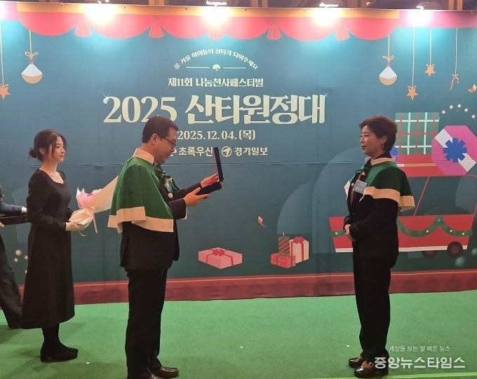 (중앙뉴스타임스 = 방재영 기자) 경기도의회 정경자 의원(국민의힘)이 지난 4일 수원특례시 장안구 복합문화공간 111CM에서 열린 ‘제11회 나눔천사페스티벌 2025 산타원정대’에서 아동·청소년 복지 향상과 사회적 나눔 문화 확산에 기여한 공로를 인정받아 초록우산 어린이재단으로부터 감사패를 수상했다.